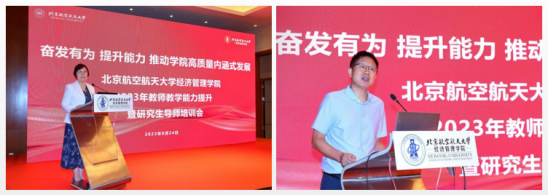 本次培训会特别邀请了七位校内外专家进行专题报告和讲座。北京师范大学的赵春明教授分享了高校教师如何成为好老师和大先生的心得体会,探讨了师德与师能的辩证关系,强调教师不仅要传授知识,还要成为品格教育的引领者。中央财经大学金融学院副院长苟琴则着重解读了如何提升课程建设,强调课程质量的科学性、规范性和系统性。北航仪器科学与光电工程学院教授、北航教务部部长钱政教授分享了二十年的教育经验,强调专业建设的重要性和教学改革的必要性,并提倡青年教师勇于担当。物理学院院长吕广宏则从教学成果奖申报的角度出发,鼓励教师科研化教学,注重成果积累。北航出版社理工图书分社社长蔡喆为参会教师详细解读了国家教材管理政策和新型云教材的应用。北航研究生院副处长郑磊分析了研究生学位论文质量提升的形势和意义,强调严格管理和落实质量控制措施。经管学院王理教授重点讲述了国家重点专项申请经验,并阐释了其在推动科技创新方面的作用。