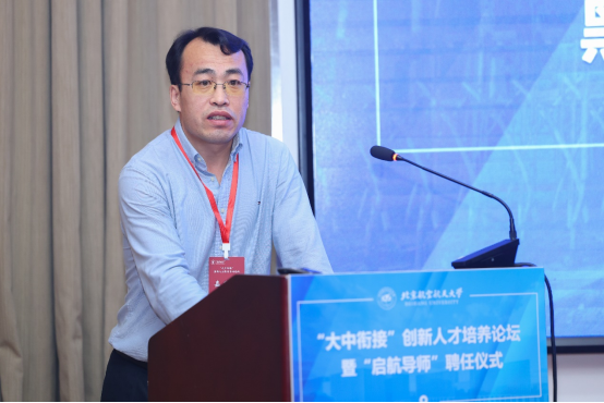 我校副校长黄海军致辞讲话,他向参会嘉宾介绍了北航历史沿革、学科建设、人才培养等基本情况,针对“大中衔接”工作,黄海军副校长高度重视,学校大力鼓励和支持品牌教授采取前置课等多种形式,通过科学方法论的提前介入和价值观的导向来提高学生的综合素养、缩短迷茫期,同时欢迎各中学师生来访北航、给北航“提菜单”,由北航“设计路线”,深入探索建立轻装备联合实验室等途径以加强人才培养的衔接。