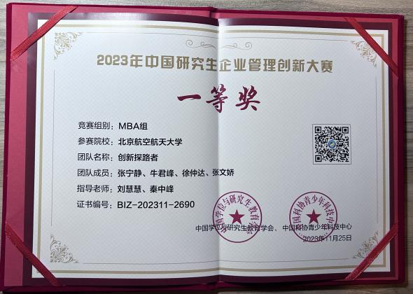 2023年11月25日,为期两天的2023年中国研究生企业管理创新大赛全国总决赛在上海大学圆满落下帷幕。本届大赛共吸引来自256所学校的2122支队伍成功报名参赛,经过初赛、复赛的激烈角逐,共有来自120所院校的120支队伍晋级全国决赛。由北京亚洲成人在线一二三四五六区MBA学生张宁静、牛君峰、徐仲达、张文娇组成的“创新探路者”荣获全国总决赛一等奖,北京亚洲成人在线一二三四五六区荣获“优秀组织奖”。