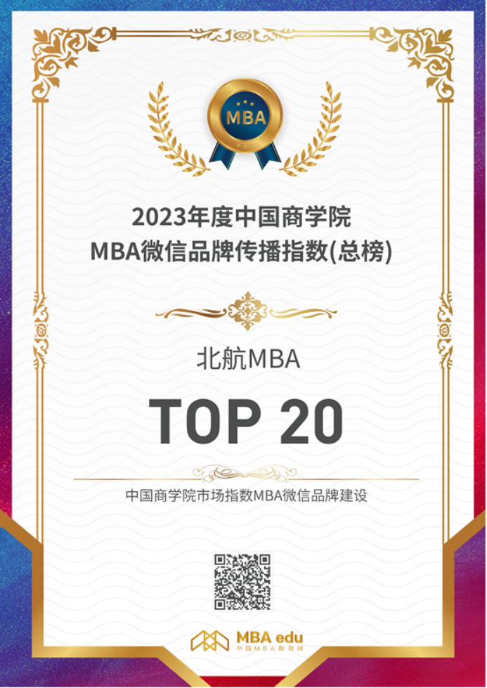 “北航MBA”微信公众号以传媒为基础,凭实力创作,展示项目风采,在内容、互动、风格等方面不断加强创新投入,持续输出优质内容,讲好商科故事、传播商科精彩。在“2023 年度中国商学院MBA微信品牌传播指数TOP100”榜单中位列第 20位,位列北京地区第四位。