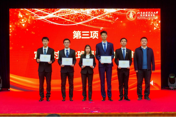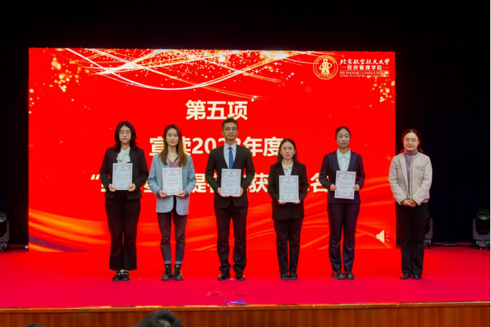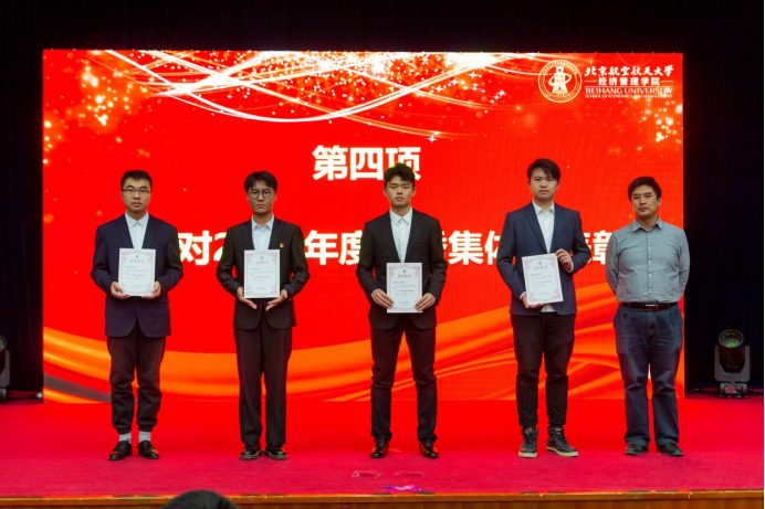 大会第四项,郝金星老师宣读2023年经济管理学院优秀集体名单并为获奖集体颁奖,表彰学院各团队在学术研究、社会实践、文体活动等方面取得的骄人成绩。他们分别是:学院党员先锋队——“防金融诈骗”宣讲团、“经英悦动”体育服务队、“读懂中国”实践队、志愿服务队;中国大学生排球联赛季军——北航女子排球队;首都高校足球联赛季军——北航男子足球队;中国研究生企业管理创新大赛一等奖队伍——MBA-“创新探路者”队;北京市先进班集体——200816班;暑期社会实践校级一等奖——北航文博馆实践队;校级十佳宿舍——D5-402C宿舍;学院“经英启航”学生发展辅导中心——全体学生骨干团队。