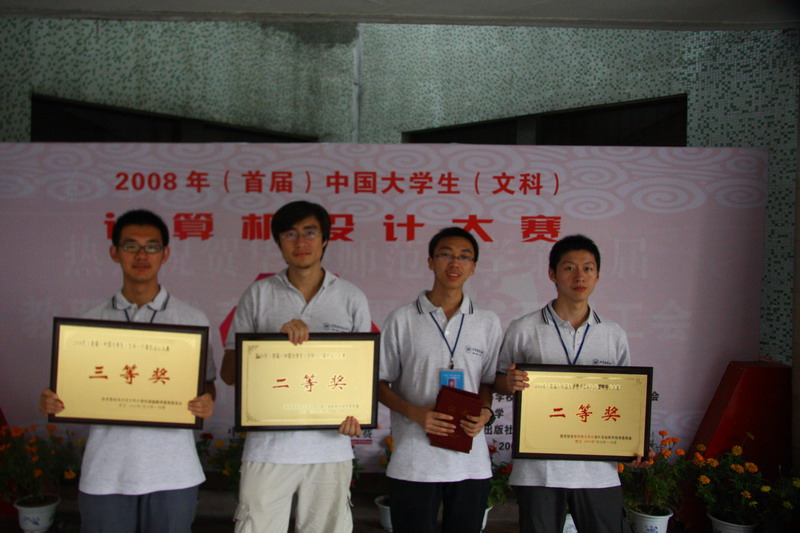 我校在2008年(首届)全国高校文科类大学生计算机设计大赛决赛中获得两项二等奖、一项三等奖及团体精神文明奖。此次大赛决赛与7月28日—31日在华中师范大学(武汉)举行,我校以经管学院副院长魏法杰教授为领队一行9人参加了此次比赛。我校的三支参赛队经过计算机水平测试及现场演示答辩在58所高校134支参赛队中脱颖而出连获三项大奖,为我校争得了荣誉。