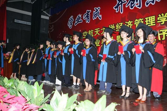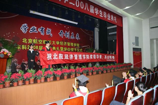 学位授予仪式结束后,刘志新书记宣读北京市和北航优秀毕业生名单,全体出席老师上台为获得北京市和北航优秀毕业生称号的同学颁发证书并合影留念。最后,学生代表向学院赠送了纪念横幅——祝北航经济管理学院续谱华章,再创辉煌。毕业典礼场面隆重气氛热烈,在同学和家长热烈的掌声中结束。