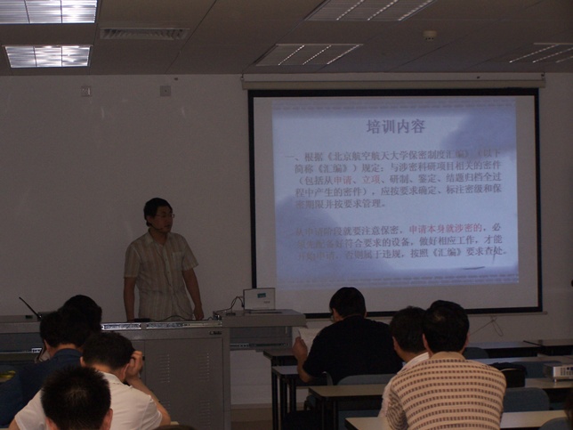 刘书记在会上通报了前一阶段我院保密工作的检查情况,强调了奥运期间做好保密工作以及普及保密知识的重要性。保密员曹明结合保密处新版《保密制度汇编》,就保密工作责任制、保密工作奖惩以及涉密课题申请、涉密论文管理等规定做了简要介绍,并对信息系统和办公设备技防措施进行了讲解。参加培训的人员还一起观看了《保密技术专题演示片》和《警钟长鸣》保密教育警示片。