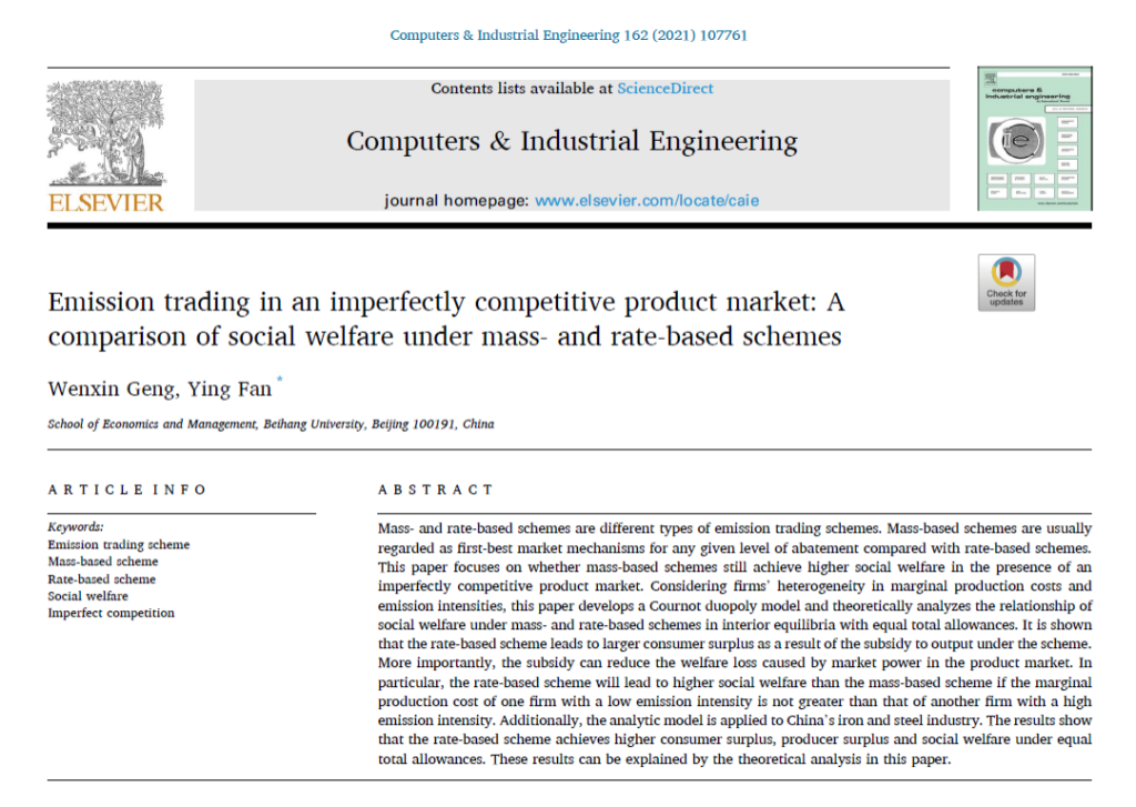 范英教授和博士生耿文欣近日发表最新研究成果,对于碳市场的两种主流配额分配方法的社会福利进行了理论分析,证明当产品市场不完全竞争且减排基准要求较高时,基于强度的碳交易机制的社会福利更高。
