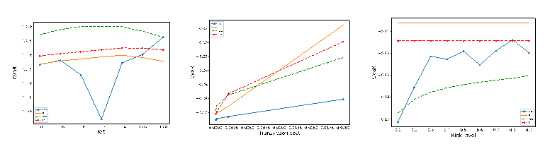 图1 模拟市场下,四种策略在不同波动率、执行价格、风险系数下的CVaR损失