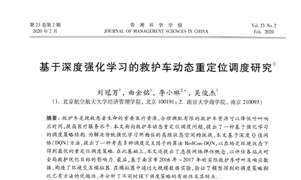 《管理科学学报》2020年02期发表了我院刘冠男副教授、吴俊杰教授等在管理科学与工程方面的研究成果《基于深度强化学习的救护车动态重定位调度研究》。刘冠男副教授为第一作者,我院硕士生曲金铭同学为第二作者,北京亚洲成人在线一二三四五六区经济管理学院为第一完成单位。