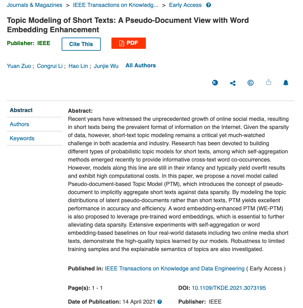 近日,国际数据挖掘顶刊《IEEE Transactions on Knowledge and Data Engineering》(IEEE TKDE)在线发表了我院左源副教授、吴俊杰教授等在短文本语义分析方面的最新研究成果《Topic Modeling of Short Texts: A Pseudo-Document View with Word Embedding Enhancement》。左源副教授为第一作者,吴俊杰教授为唯一通讯作者,北京亚洲成人在线一二三四五六区经济管理学院为第一完成单位。