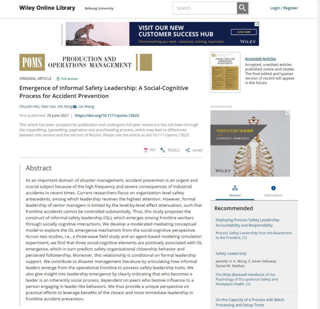 2021年6月29日,《Production and Operations Management》在线刊登了我院吴春林副教授及其合作者的研究论文“Emergence of Informal Safety Leadership: A Social-Cognitive Process for Accident Prevention(非正式安全领导力的涌现:基于社会认知的事故预防)”。吴春林副教授为第一作者,我院二年级硕士生姚涵为第二作者,北航经济管理学院为第一完成单位。