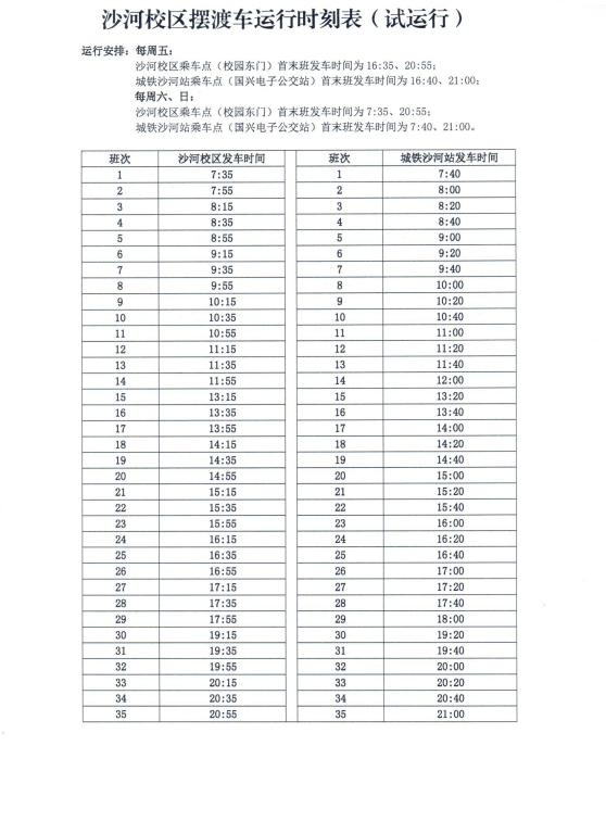 根据新学期两校区校车运行实际情况,为尽量满足往返两校区师生对校车的使用需求,自2018年10月29日起,对两校区校车运行时刻表(试运行)进行微调,沙河摆渡班车时间不变。请您认真查看校车时刻表,以免延误您的出行。