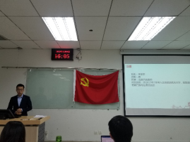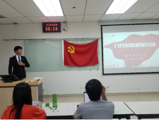 陈钒同志介绍了个人基本情况、党校培养情况、校外实践活动等。学习情况从大一到大二有很大进步,获得了校三好学生、校优秀生等荣誉称号,参加过致真书院答疑团、经管学院17级大班长等学生工作。同时作为1910重大活动的参与者,陈钒同学向大家分享了自己的感受,重点表达了国庆当天走过天安门的激动之情。
