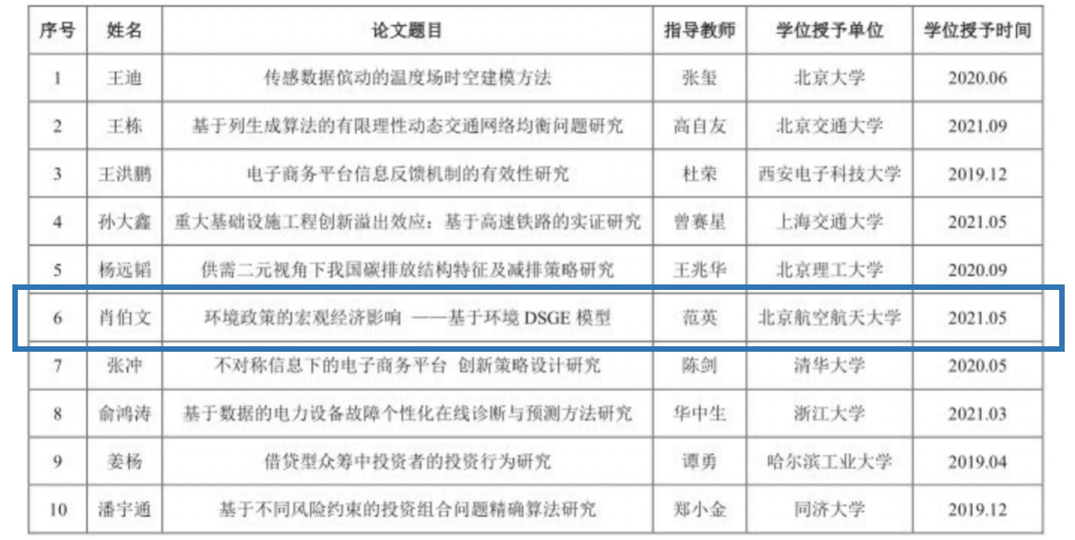 2022年下半年,管理科学与工程学会公布了2022年管理科学与工程学会“优秀博士学位论文奖励计划”评选结果。北京亚洲成人在线一二三四五六区经济管理学院2021年博士毕业生肖伯文的博士学位论文《环境政策的宏观经济影响——基于环境DSGE模型》经过层层严格评选,最终入选2022年管理科学与工程学会“优秀博士学位论文奖励计划”名单,指导教师为范英教授。全国各高校共有10篇博士学位论文入选。