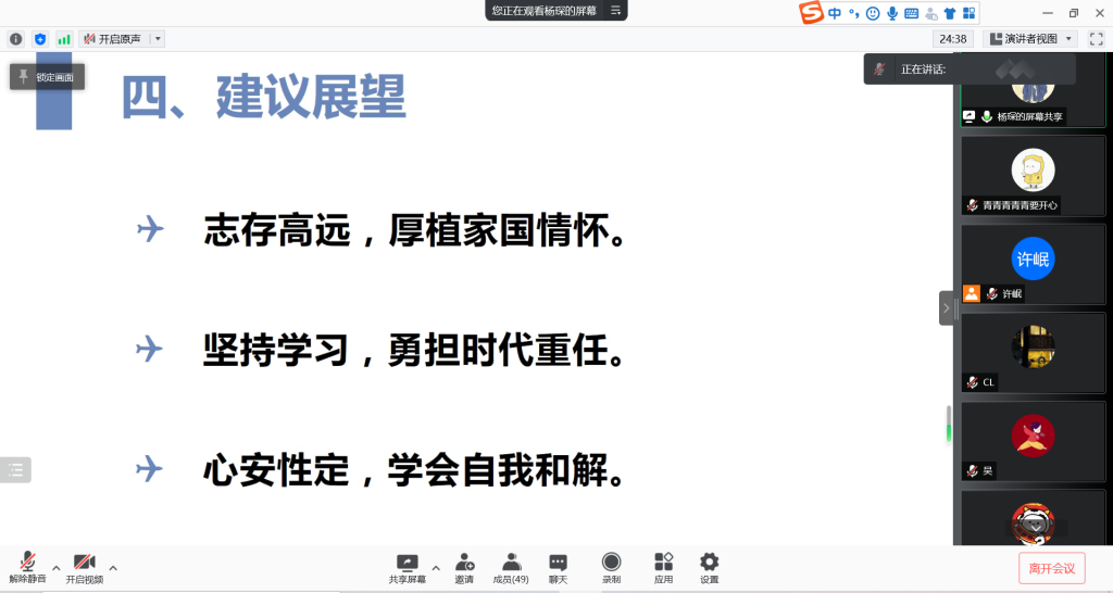 杨琛首先从自我定位、信息收集、岗位分析等方面与大家分享了如何确定自己的求职意向。然后向大家介绍了选调生招录的相关信息和经验,并分享了自己在工作岗位中如何与干部群众一起做好疫情防控和脱贫攻坚,他鼓励同学们志存高远、坚持学习、心安性定,在中华民族伟大复兴的征程中勇做时代的弄潮儿。