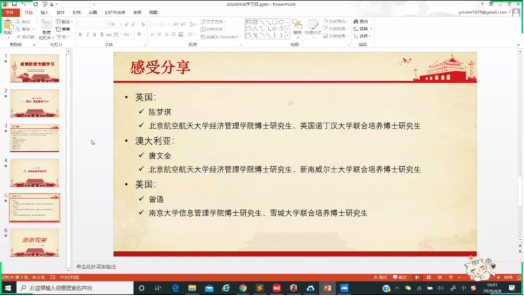 第二个部分是分享学习。通过来自英国、澳大利亚和美国三个不同国家的留学生分享所在国家的抗疫工作情况,了解新冠肺炎疫情在世界各国的基本情况以及中国大使馆对当地留学生的关心和关怀。首先,北京亚洲成人在线一二三四五六区经济管理学院博士研究生、英国诺丁汉大学联合培养博士研究生陈梦琪进行了在线分享。陈同学谈到英国人对新冠肺炎疫情不太重视,并且出门不太喜欢戴口罩。英国的医疗机构不给轻症患者做检测,从而导致很多轻症患者不能得到及时的救治。中国大使馆给在英国的留学生发放了健康包,以帮助留学生对抗新冠肺炎疫情。其次,北京亚洲成人在线一二三四五六区经济管理学院博士研究生、新南威尔士大学联合培养博士研究生唐文金进行了视频分享。唐同学提到澳大利亚政府考虑到经济发展等因素,所采取的防控措施并没有中国采取的防控措施那么严格,从而使得澳洲的疫情没有得到有效的控制。在物资供应方面,澳洲出现了物资供应不足的现象。人们需要一大早进行物资采购,否则可能出现物资短缺。中国驻澳洲领事给澳洲留学生建立了相关微信群,实时更新疫情相关的信息。大使馆也从国内联系口罩供应商,组织线上讲座,帮助留学生认识新冠肺炎疫情、解决留学生口罩短缺的问题。最后,南京大学信息管理学院博士研究生、雪城大学联合培养博士研究生曾通进行了视频分享。曾同学说大部分美国人都处于居家的状态,并且学校都改为线上授课的形式,并设置专门的版块实时分享疫情相关的信息,以帮助学生了解最新的疫情资讯。在物资供应方面,美国各大超市对居民购买物资的数量进行了限制,所以美国各大超市的物资供应相对充足。中国大使馆也与在美留学生保持联系,并在有必要时提供力所能及的帮助。