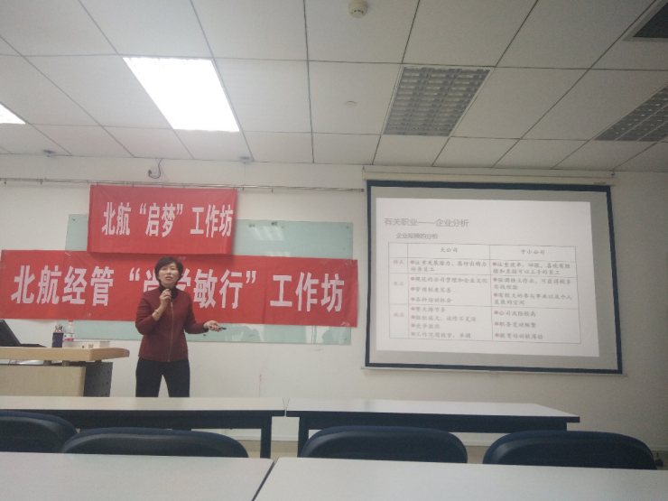 4月20日下午三点北航启梦工作坊北航经管尚学敏行工作坊联合主办经管学院职业发展中心承办求职和面试技巧讲座在新主楼A座1028成功举办讲座邀请到北京青云航空仪表有限公司人力资源部部长张进老师为大家进行求职技巧分享,并邀请到党委副书记王喜忠老师,研究生工作办公室衣萌老师到场参会