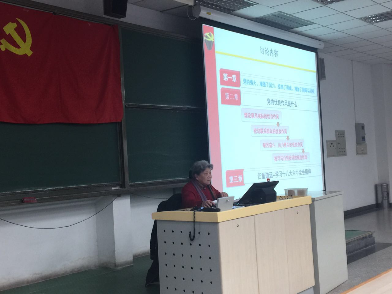 本次党课,满头白发的老党员杨念梅老师对党的优良作风的重要性进行了论述。杨老师主要从作风彰显形象、作风代表态度、作风反映能力、作风是一面镜子、以良好的党风带动政风民风、优良的党风是我党90多年奋斗经历的总结与传承、打铁还需自身硬---中国共产党党员应该具备的优良品质和作风等方面进行讨论。