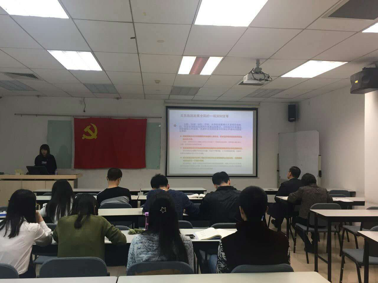 本次微党课由支部蒋丽娜、孙瑞鸿和李佳鸿三位同学主讲。蒋丽娜同学围绕全力推进法治中国建设,做了关于全面依法治国的微党课报告。孙瑞鸿同学基于全面从严治党的核心思想,对打铁还需自身硬做了详细的阐释。李佳鸿同学着重介绍了关于树立创新、协调、绿色、开放、共享的发展理念,对以新发展理念引领发展给出了自己的深刻理解。