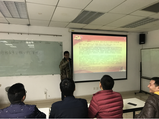 首先,班长傅星球介绍了社会主义核心价值观的概念内涵。让同学们了解社会主义核心价值观的基本内容有哪些,并且带领同学们从国家层面、社会层面以及公民个人层面对社会主义核心价值观进行深刻理解。