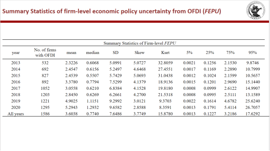 接下来,张教授详细的介绍了本文的指标构建和模型设定。文章的核心指标为企业层面经济政策的不确定性(FEPU),衡量方式为:首先计算OFDI 风险敞口,再将 OFDI 风险敞口与月度经济政策不确定性指数(EPU)进行匹配,最后将加权经济政策不确定性指数相加,得出来自OFDI(FEPU)的企业级经济政策不确定性。并对指标进行了描述性统计的介绍。