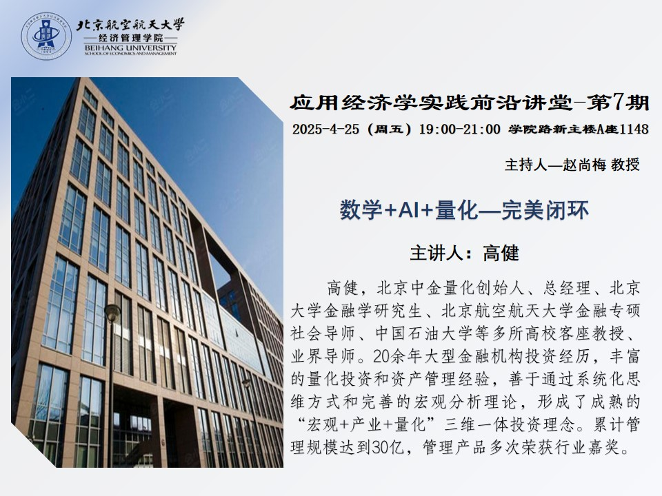 2025年4月25日,由北航经管学院金融专业硕士教育中心主办的应用经济学实践前沿讲堂第七期《数学+Al+量化——完美闭环》在北航新主楼A1148圆满落幕。本期讲堂由赵尚梅教授主持,特邀北京中金量化创始人、总经理高健担任主讲嘉宾。高健为北京大学金融学研究生、北京亚洲成人在线一二三四五六区金融专硕社会导师、中国石油大学等多所高校客座教授、业界导师。他拥有20余年大型金融机构投资经历,丰富的量化投资和资产管理经验,善于通过系统化思维方式和完善的宏观分析理论,形成了成熟的“宏观+产业+量化”三维一体投资理念。累计管理规模达到30亿,管理产品多次荣获行业嘉奖。