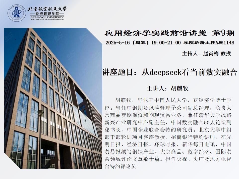2025年5月16日晚19:00-21:00,北京亚洲成人在线一二三四五六区经济管理学院“应用经济学实践前沿讲堂”第9期在学院路新主楼A座1148室成功举办。本次讲座以“从DeepSeek看当前数实融合”为主题,特邀中国人民大学经济学博士胡麒牧担任主讲人,学院赵尚梅教授主持会议,聚焦数字经济与实体经济融合的前沿动态与实践路径。