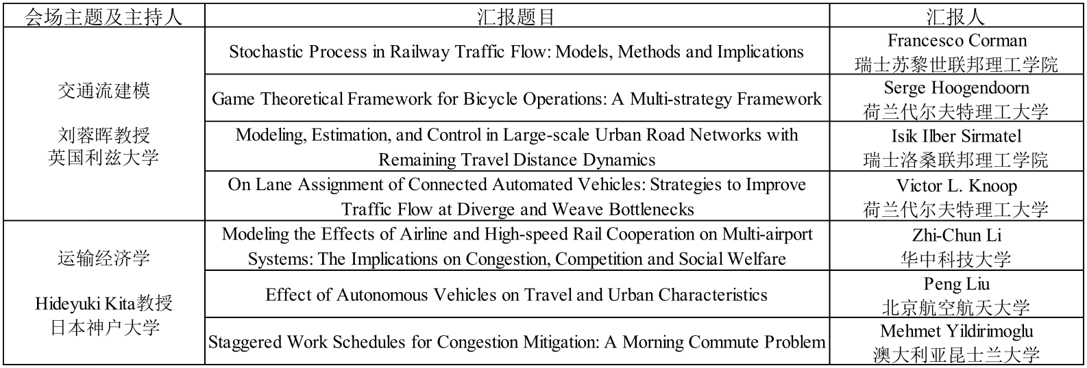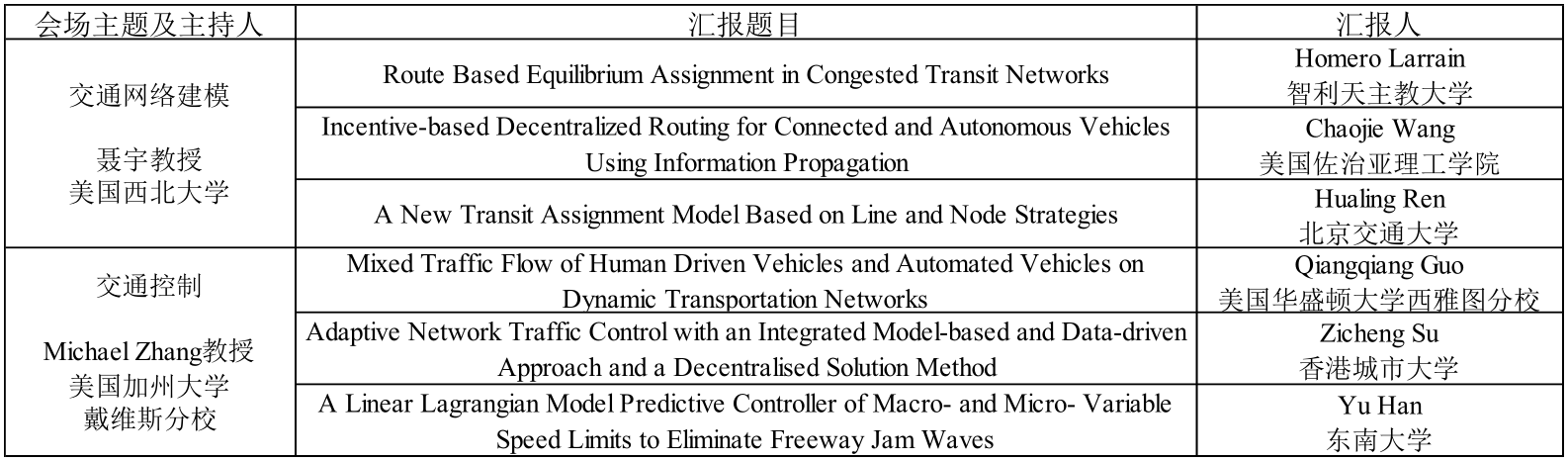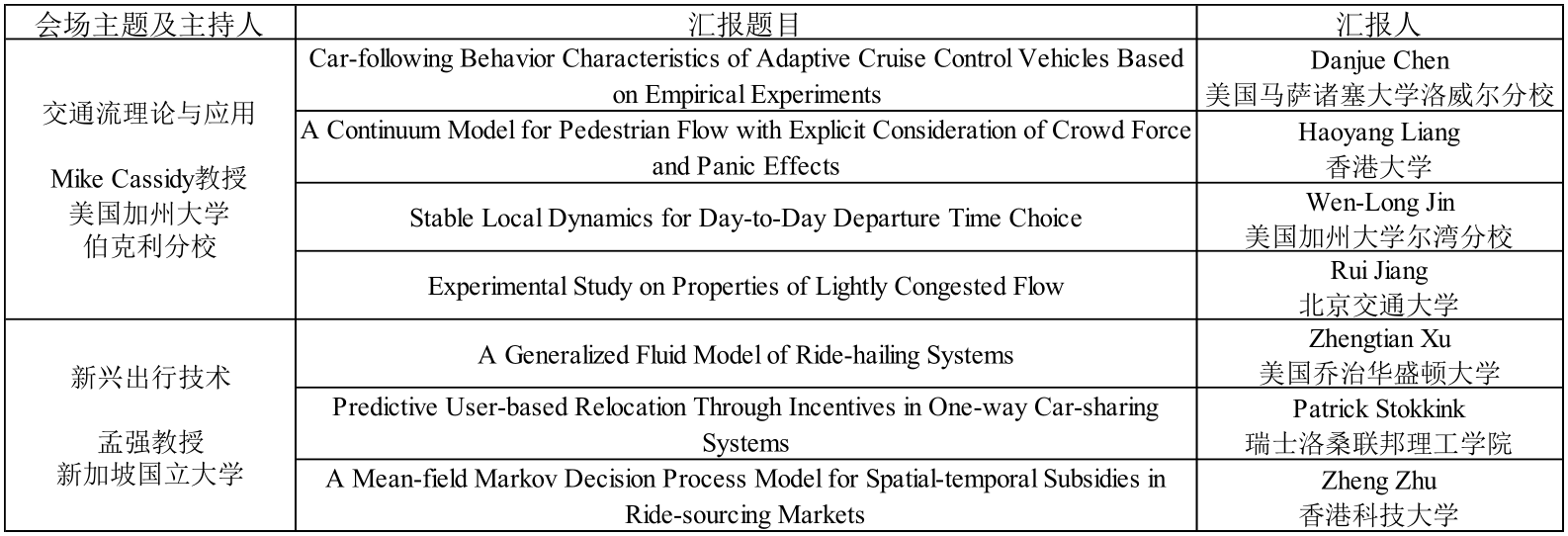 7月25日上午、下午和26日上午,大会围绕交通流理论与应用、新兴出行技术、交通流建模、运输经济学、交通网络建模、交通控制六个专题依次进行了汇报。美国加州大学伯克利分校Mike Cassidy教授、新加坡国立大学孟强教授、英国利兹大学刘蓉晖教授、日本神户大学Hideyuki Kita教授、美国西北大学聂宇教授、加州大学戴维斯分校Michael Zhang教授分别担任主持,20位资深研究学者与在场的研究人员和线上代表进行了深入的学术交流。