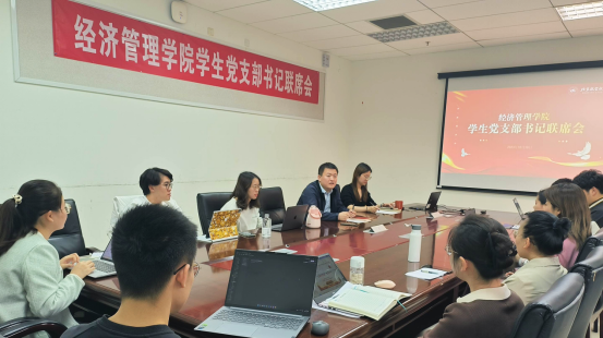 2023年10月18日下午,经济管理学院召开学生党支部书记联席会,通过文件导学、专题领学、交流互学的方式,以传达学习、工作部署、工作交流三个环节为主线,为学生党支部书记提供学习和交流的平台。学院党委副书记高超、专职辅导员陶雨芊以及学生党支部书记出席了本次会议。