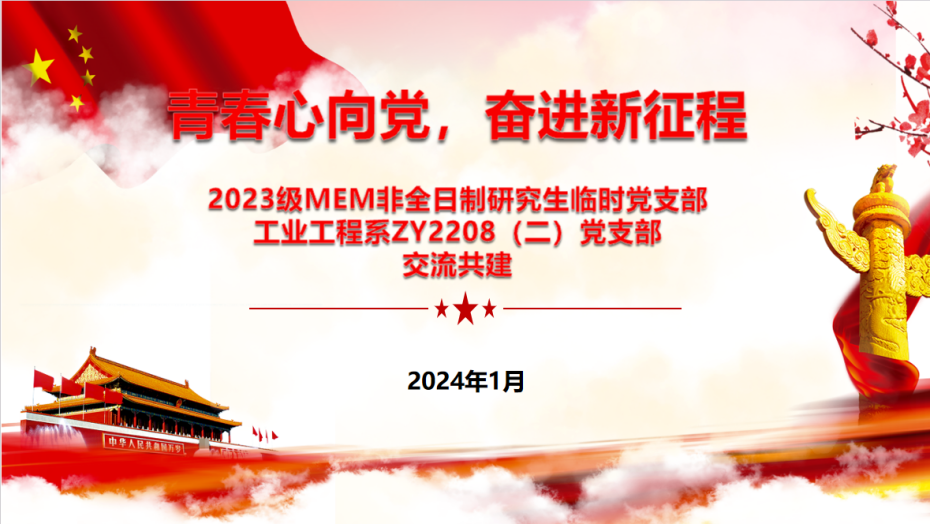 近日,2023级MEM非全日制研究生临时党支部与工业工程系ZY2208(二)党支部携手开展“青春心向党,奋进新征程”支部共建活动。经济管理学院党委副书记高超,北航MEM教育中心主任闪四清、副主任程玉辉,2023级MEM非全日制研究生临时党支部以及ZY2208(二)党支部党员和入党积极分子共计60余人参加活动。本次会议由2023级MEM非全日制研究生临时党支部书记李彬同学和ZY2208(二)党支部书记谢纪帆同学共同主持。