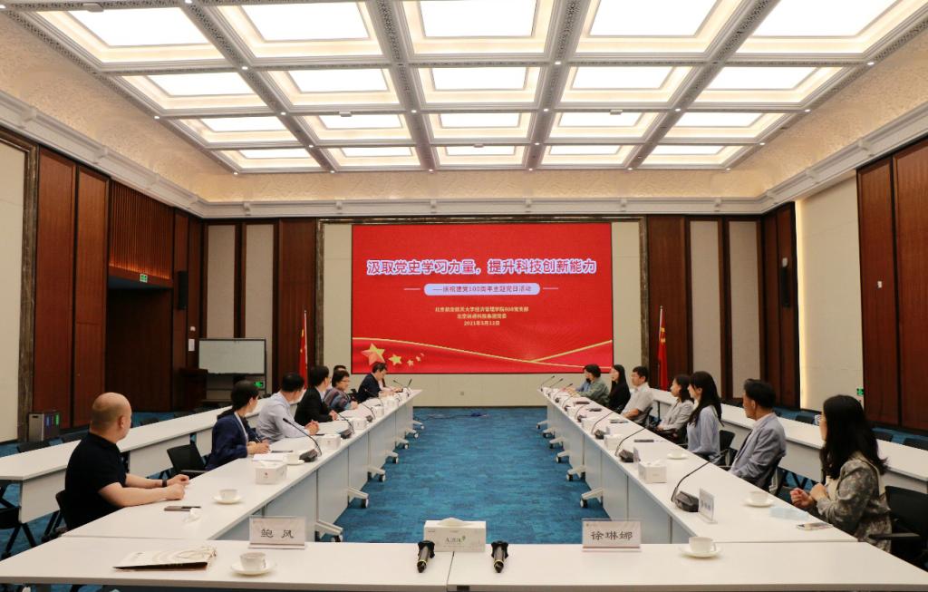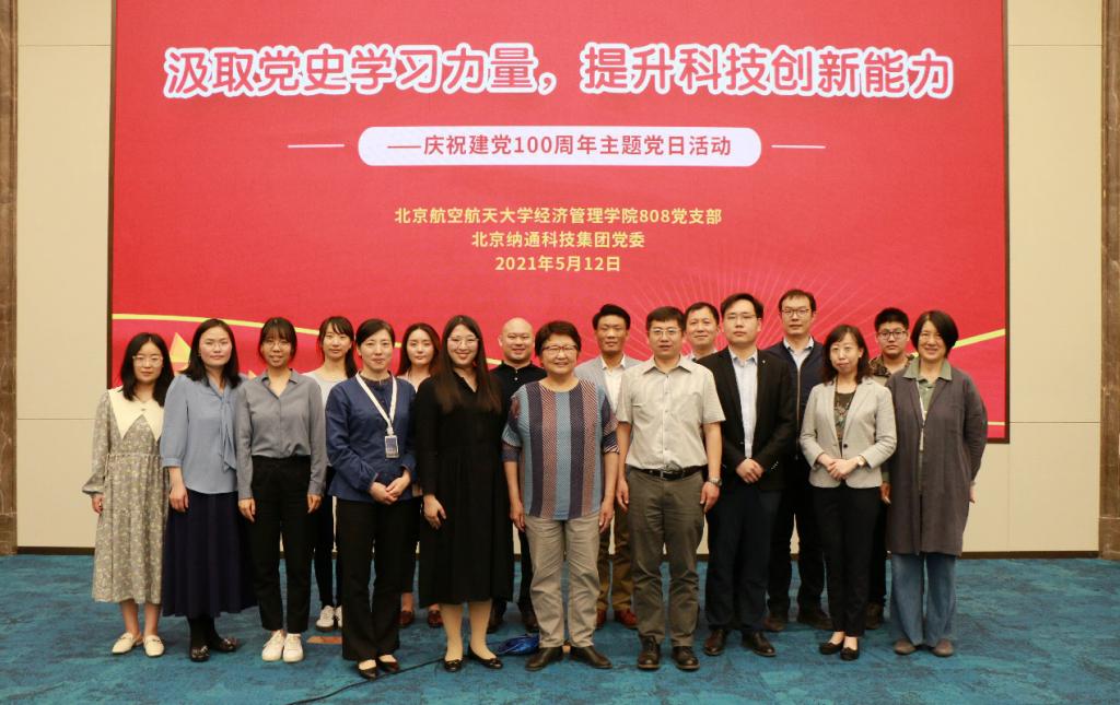 时值中国共产党成立100周年之际,为贯彻落实习近平总书记在党史学习教育动员大会上的重要讲话精神,进一步做到学史明理、学史增信、学史崇德、学史力行,2021年5月12日,经济管理学院808党支部前往北京纳通科技集团(简称纳通),与纳通党委共同开展 “汲取党史学习力量,提升科技创新能力” 主题党日活动。北航经管学院研究生指导主任单伟、808党支部副书记陈婧带领808支部党员、部分师生群众代表共十人与纳通集团党委书记修月娥、副书记李明强,集团党委委员王双宝、郝明金,人力资源高级总监钱威、研发中心总监段红平等人参加共建活动。