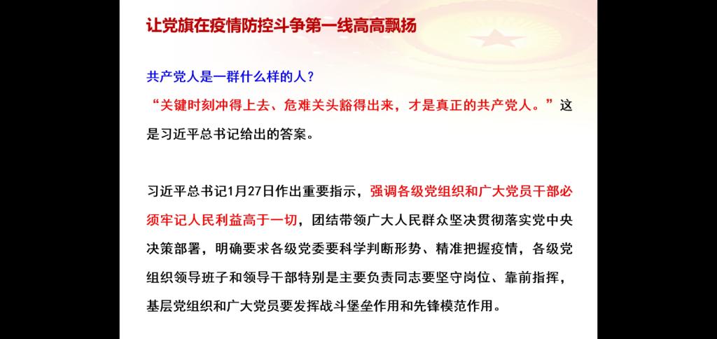 刘志新书记首先以“共产党人是一群什么样的人?”为切入点,引发师生思考。他谈到,在新冠肺炎疫情防控斗争中,各级党组织和广大党员,守初心、担使命,冲锋在前、忘我拼搏,充分发挥了战斗堡垒作用和先锋模范作用,充分彰显了中国共产党是中国工人阶级的先锋队,是中国人民和中华民族的先锋队。这些感人事迹充分印证了习近平总书记给出的答案“关键时刻冲得上去、危难关头豁得出来,才是真正的共产党人”。