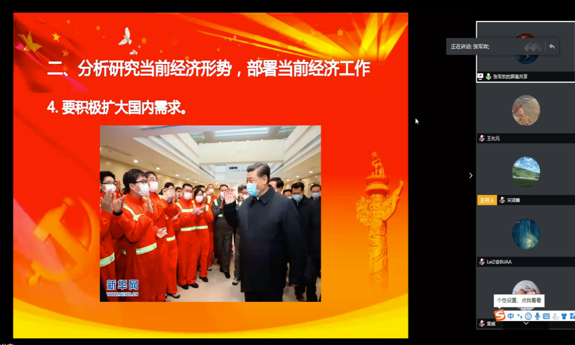 我院张军欢老师带领与会的党员和学者深入学习了《习近平总书记关于新冠肺炎疫情防控的重要讲话精神》。依据中共中央政治局4月17日的会议精神,从疫情防控和经济建设两个方面进行了系列重要讲话和新闻的分析解读。从疫情防控方面,我们要牢牢把握“内防反弹,外防输入”的方针,对我国当前向好的疫情防控态势作进一步巩固。从经济建设方面,我们要仔细分析研究当前经济形势,部署经济工作,稳中求进,坚决打好脱贫攻坚战,积极扩大内需,稳定就业,进一步完善要素市场化配置。