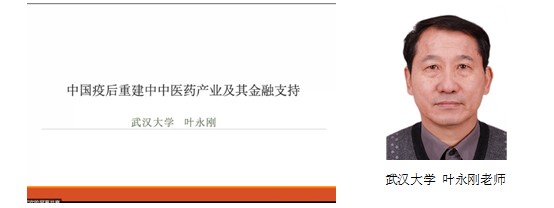 武汉大学叶永刚教授做了题为“中国疫后重建中中医药产业及其金融支持”的主题报告。叶教授分别从中医药产业在这次武汉抗疫中的巨大贡献、中医药当前面对的重要问题和金融如何支持中医药产业发展三个方面阐明了中医药产业对于此次抗疫的重要意义,以及如何更好地发展中医药产业。