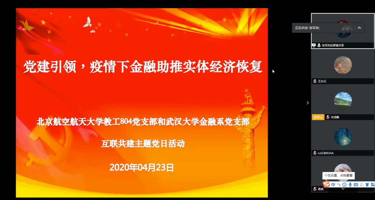 2020年4月23日下午,经济管理学院教工804党支部联合武汉大学经济与管理学院金融系党支部在线召开“党建引领,疫情下金融助推实体经济恢复”的互联共建主题党日活动。