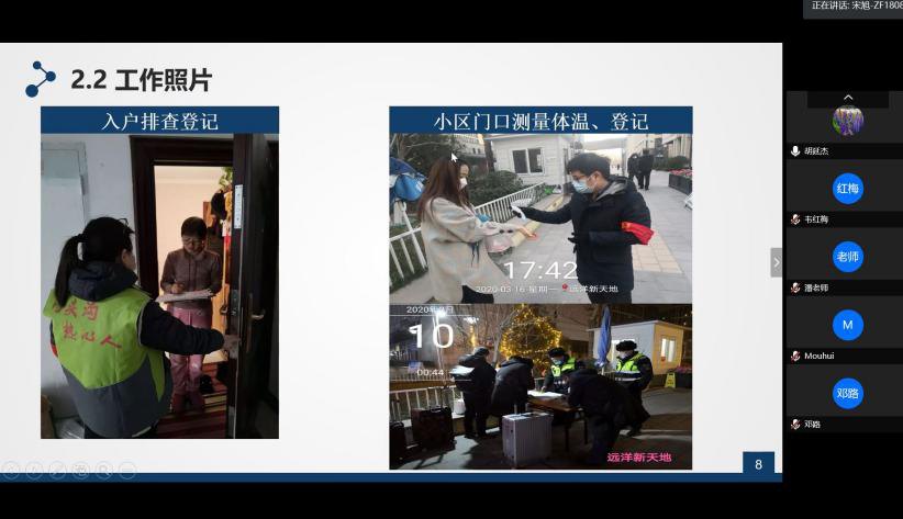 2018级MPAcc学生党员常梦瑶在北京市集散点负责湖北地区返京人员的转运工作。她介绍了北京市对湖北居民返京的全过程闭环管理政策。在对比参与庆祝新中国成立70周年表演和此次防控疫情的经历时,她表示,这些经历让她感受到祖国的强大和凝聚力,不光能在繁华盛世举国同庆,更能在危机关头保卫人民。