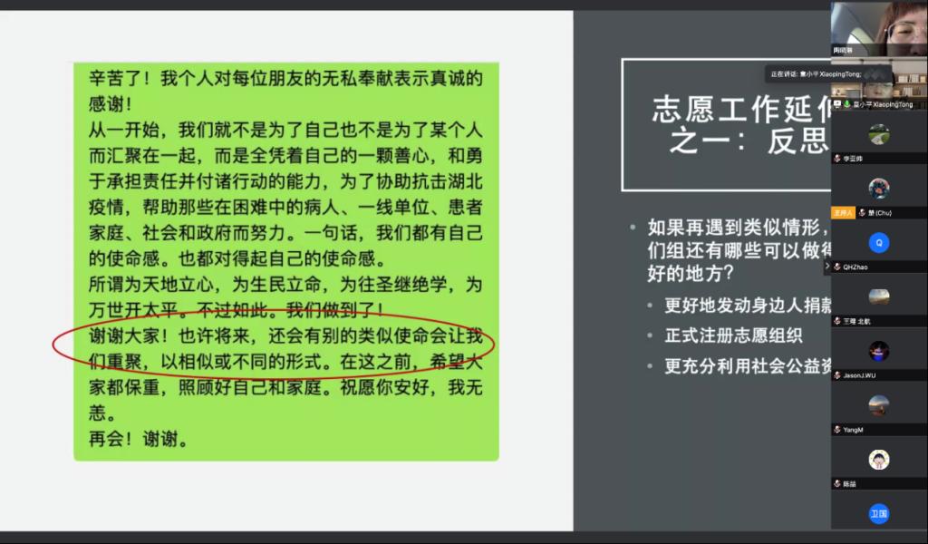 博士生王宇讲述了她在美国芝加哥大学访学的见闻。她谈到当地政府已经开始对民众聚集出行进行管控,但全国上下统一思想、统一行动的中国力量是其他国家所缺少的。她表示,中国抗疫工作充分体现了中国特色社会主义制度和国家治理体系的优势。首先习近平总书记亲自指挥、亲自部署,各地方政府积极行动,基层党组织雷厉风行,党员冲锋在前,展现了中国共产党不屈不挠的昂扬斗志。其次,党中央时刻关心人们,以人民为中心,把人民群众生命安全和身体健康放在第一位,体现了我国以人为本的价值追求,同时人民也充分相信党的正确领导,积极参与,体现了党和人民的鱼水之情。第三,社会主义具有强大的动员、协调能力,各省市能够互帮互助,体现了国家治理体系和集中力量办大事的优势。这些都向世界展现了中国的大国担当和对人类发展的高度责任感,也说明只有各国政府团结一致,抛开意识形态、地缘政治因素,才能共同战胜疫情,维护全球经济稳定。