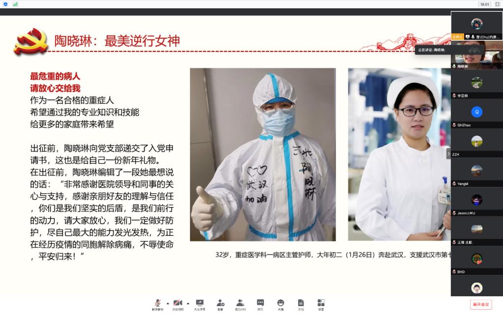 会上,刚撤离武汉、重返工作岗位的陶晓琳与大家分享了报名驰援武汉的心路历程,“不管情况怎么样,我要去尽自己的一份力。”谈到工作经验和责任担当时,陶晓琳也讲述了自己初入武汉市第七医院时面临的艰苦环境和不安情绪,并一点点克服适应的过程。她也分享了两个监护案例,以及在此过程中感受到的众志成城,和武汉人民的互助、互谅的感人情谊。她表示希望尽自己最大的努力,用所学的专业知识与病毒对抗,为患者筑起“安全防护墙”,守护人民群众生命安全,与祖国人民同命运、共进退!