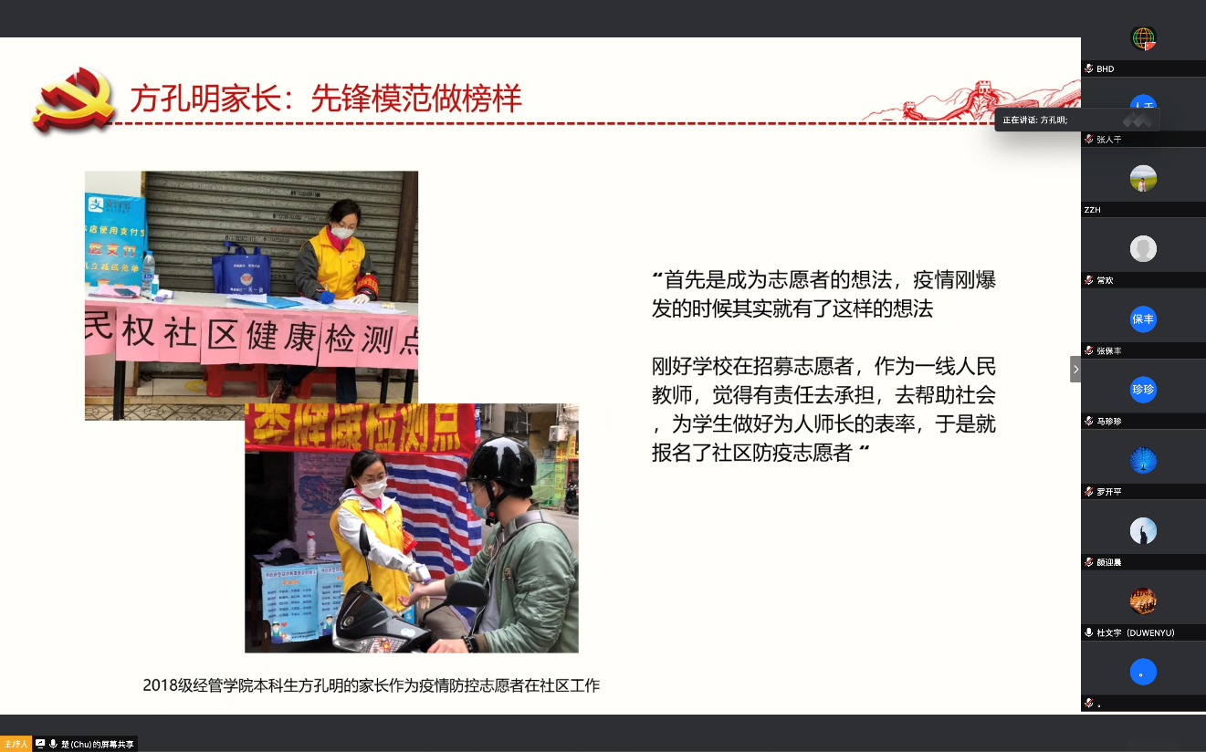 2020年4月10日,由经济管理学院803党支部主办,802党支部协办,联合举行“科学防疫、共待春来”系列在线主题党日活动第一期,邀请四位在抗疫一线的医护人员、家长、学生、青年教师分享自己的志愿经历,803支部副书记张楚主持会议。
