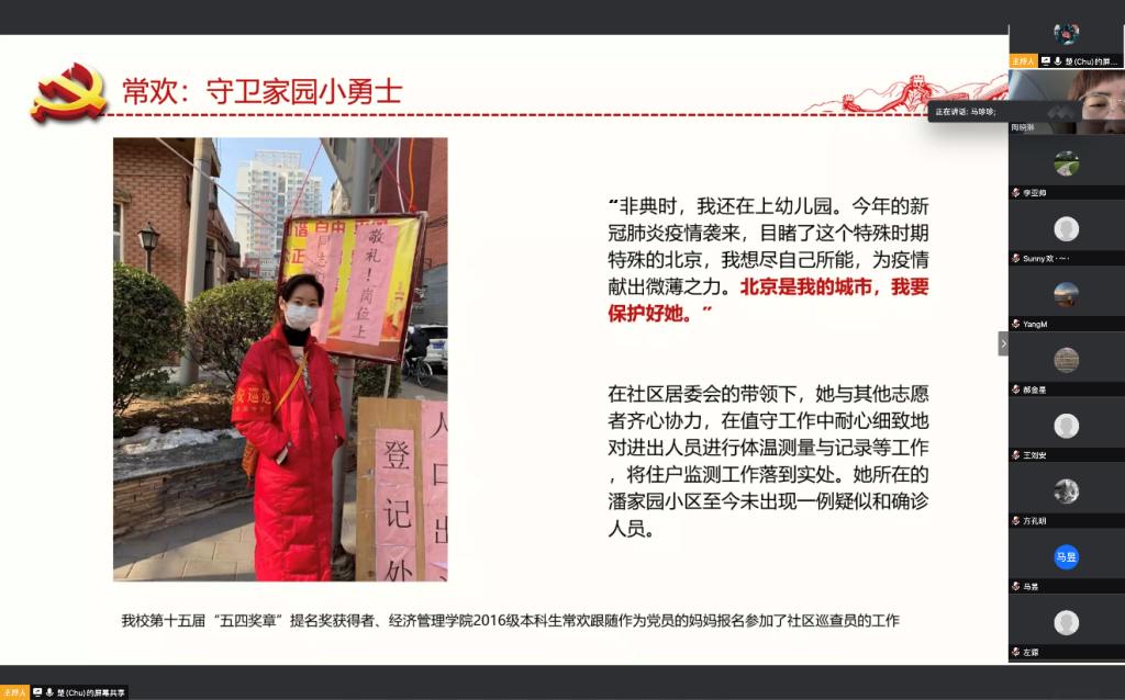 在疫情爆发初期,常欢便跟随作为党员的妈妈报名参加了社区巡查员的工作。在社区居委会的带领下,她与其他志愿者齐心协力,在值守工作中耐心细致地对进出人员进行体温测量与记录等工作,将住户监测工作落到实处。充分发挥模范先锋引领作用,以丰富的现场处置能力为居民的生命和财产安全保驾护航,用实际行动展现了一名当代青年的使命与担当。她所在的潘家园小区至今未出现一例疑似和确诊人员,社区安全地渡过疫情高峰期。会上,常欢与各位党员同志介绍了自己加入社区志愿活动的初心,分享了自己在社区居委会工作的点滴,及对社区防疫工作的思考。她谈到,“今年的新冠肺炎疫情袭来,目睹了这个特殊时期特殊的北京,我想尽自己所能,为疫情献出微薄之力”。
