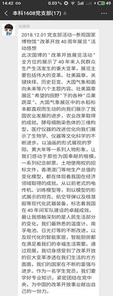 通过参观这次展览,各位党员深刻感受到了改革开放四十年以来,我们伟大祖国的巨大变化。大家表示,作为学生党员,应当不忘初心,砥砺前行,坚定理想信念,脚踏实地奋斗,努力学习专业知识,在中华民族的伟大复兴进程中贡献自己的力量。