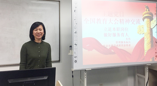 本次主题党日邀请了机关的群众一同参加,并专门邀请了北航的管理服务标兵、北京市教学成果奖获得者、本科教务秘书朱伟老师分享了多年来管理服务育人的经验。朱老师通过“细心、耐心、爱心”三心的分享,以及工作中的小故事,分享了将立德树人融入管理服务工作全过程的经验。