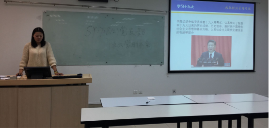 李照同学回忆了学院组织全体党员观看十九大开幕会的场景。她号召同学们认真学习十八大以来的历史成就、历史使命、习近平新时代中国特色社会主义思想和基本方略,以及社会主义现代化见着总体布局等部分。她还提到,在学习初期可以反复研读报告原文,深刻体会报告的精神,结合自身经历感受新思想、新方略的新变化,对比研究,增强与时俱进的政治素养。
