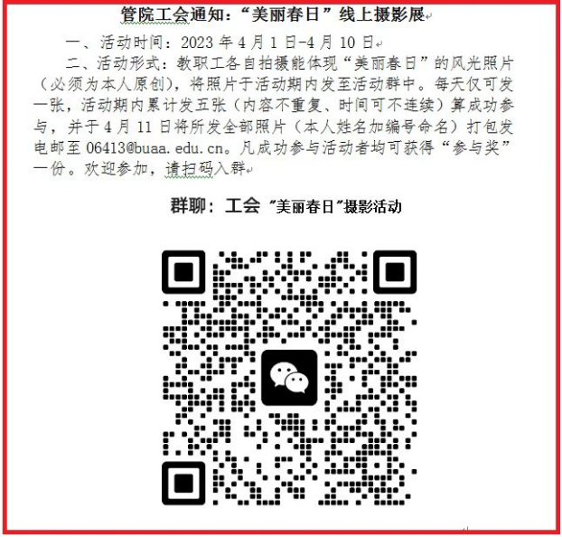 2023年4月1日—4月10日,经管学院工会在学院内组织全院教职工参加“美丽春日”线上摄影展活动。旨在帮助广大教职工在春光灿烂的4月中劳逸结合,适度运动,陶冶情趣。
