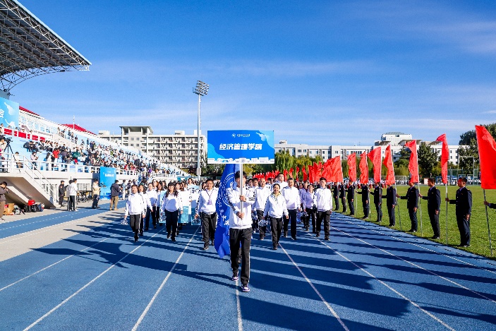 上午8时许,伴随着《运动员进行曲》激昂的旋律,学院书记郑海涛、工会主席牟晖等领导带领由70余位师生共同组成的经管学院代表团,迈着整齐有力的步伐,走向主席台。代表团精神饱满,口号响亮:“激情澎湃,勇攀新高,且看经管,搏浪弄潮!”这一声声充满自信与力量的呐喊,不仅展现了经管学院师生朝气蓬勃、积极向上的精神面貌,更体现出学院在党委的坚强领导下,凝聚起全体成员的共同信念。以管理科学与工程为核心,应用经济学和工商管理学为两翼,经管学院坚持五育并举、文化引领,正坚定地朝着建设世界一流经济管理学院的目标奋勇前行。
