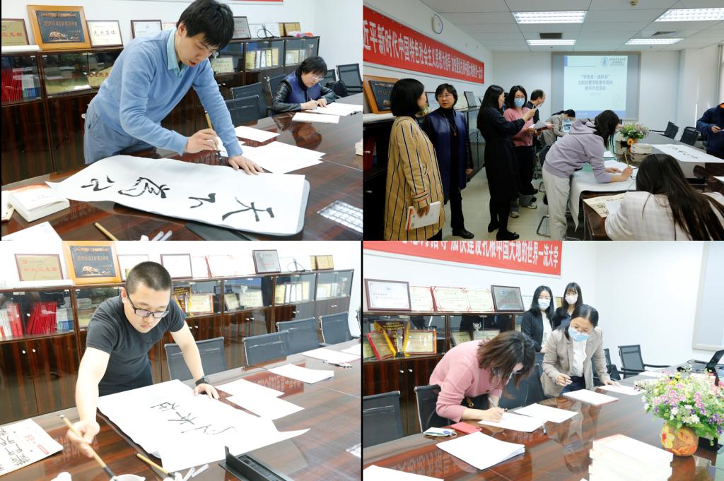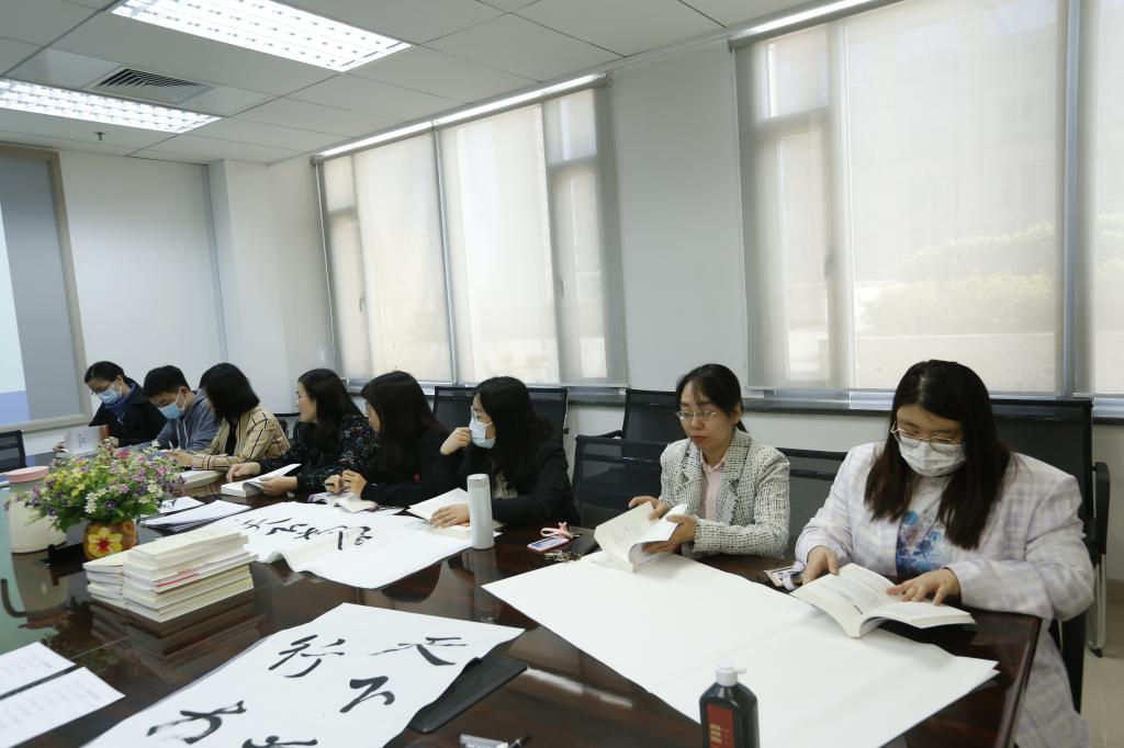 在举办读书活动的同时,经管学院还在读书沙龙现场组织了“平语近人”书法和海报设计大赛活动。学院为各位老师准备了笔墨纸砚,以习近平总书记使用过的典故为主题向全体老师征集硬笔书法、软笔书法与海报设计作品。不少到场的老师都积极参与,在活动现场完成了自己的作品。活动以创新手法展现习近平总书记新时代领路人、人民勤务员的领袖风范和为民情怀,讲好古代典籍和经典名句背后的故事与内涵。在活动的最后,经管学院工会主席谢岚老师做了总结发言。