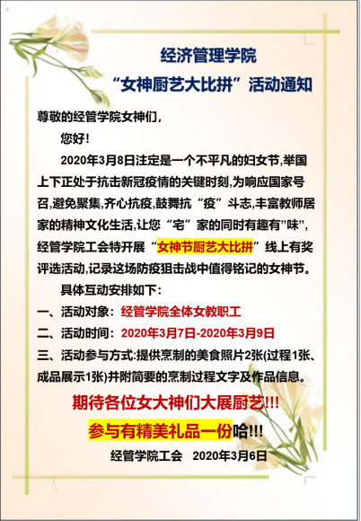 2020年3月8日注定是一个不平凡的国际劳动妇女节。在举国上下正处于抗击新冠疫情的关键时刻,为响应国家号召,避免聚集,齐心抗疫,鼓舞抗“役”斗志,丰富教师居家的精神文化生活,让学院教职工们宅得有趣有“味”,经管学院工会特开展“女神节厨艺大比拼”线上有奖评选活动。学院共有15名“女神大厨”参加了本次活动。