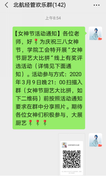本次活动采取在线组织的形式。学院工会在3月6日通过学院微信群推送活动通知,邀请全体女教职工进入活动群参加活动,并按照活动规则在3月9日晚21:00前提供烹制的美食照片2张(含过程图1张,成品展示1张),并附简要的烹制过程文字及作品信息。