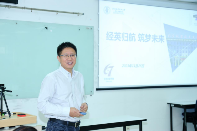 在新主楼A1048教室,返校同学欢聚一堂座谈交流,海内外未能返校同学在线上互动参与。经济管理学院党委书记郑海涛作了热情洋溢的致辞,欢迎各位校友返校,介绍了经管学院发展历程和近年来学院校友工作情况。3308大班同学一起重温美好的北航时光,共忆青葱岁月,共叙相识30年的同窗友情,共抒对母校、对管院的感恩之情,畅谈各自人生经历也共同留下对未来的美好祝福和憧憬。