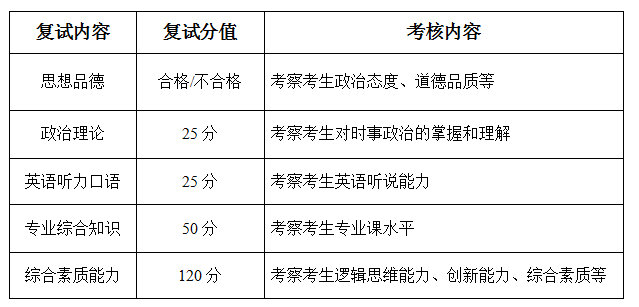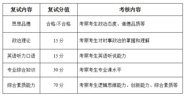 初试满分为500分的考生复试满分220分,初试满分为300分的考生复试满分130分。考生的总成绩=初试成绩+复试成绩,对于符合教育部加分政策的考生,在初试成绩的基础上累计政策加分,同等条件下优先录取。