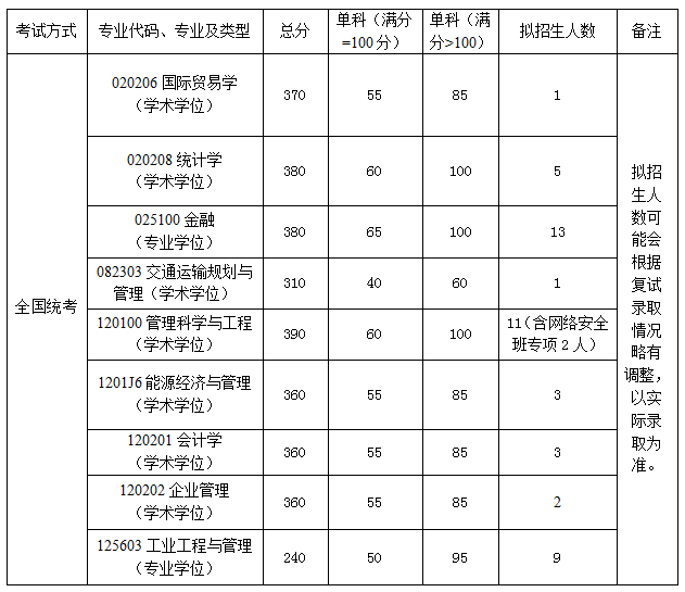 (2)满足我院复试资格线,且初试满分为500分复试成绩大于等于132分、初试满分为300分复试成绩大于等于78分的考生,结合思想政治审查和考生健康状况,根据考生报考专业,按总成绩由高到低顺序录取。对于报考同一专业的统考考生,如总成绩相同,则依据初试总分、初试专业综合成绩、初试数学成绩、复试专业综合成绩、复试综合素质能力成绩的优先顺序依次排序录取,确定拟录取名单。对于报考工业工程与管理(125603)的考生,如总成绩相同,则依据初试总分、初试管理类综合能力成绩、复试专业综合成绩、复试综合素质能力成绩的优先顺序依次排序录取,确定拟录取名单。所有考生均不进行破格复试录取。