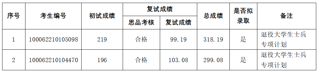 由于退役大学生士兵专项计划考生不享受加分政策,现将2022年3月29日公示的复试结果(http://mba.cqjj8.com/info/1014/6135.htm)中两名退役大学生士兵专项计划考生的复试结果更正如下: